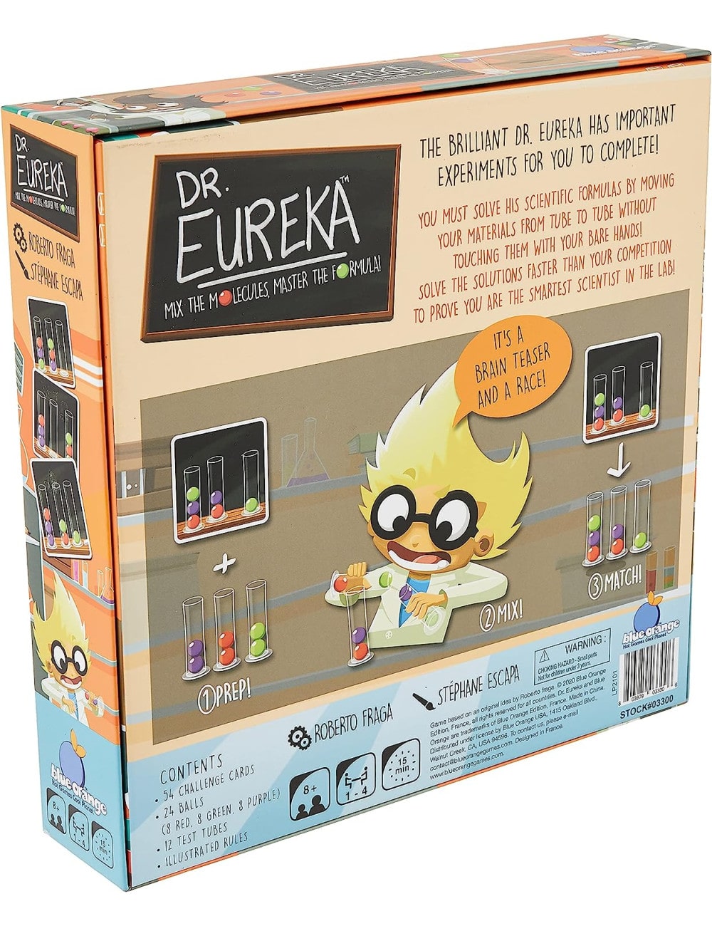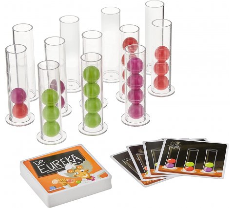 The brilliant Dr. Eureka has important experiments for you to complete! Pick a challenge card, 3 test tubes and 6 colorful balls (representing molecules) to solve his scientific formula. Mix molecules, complete the formula first, and outsmart your friends in Dr. Eureka, a brain teaser in a test tube.