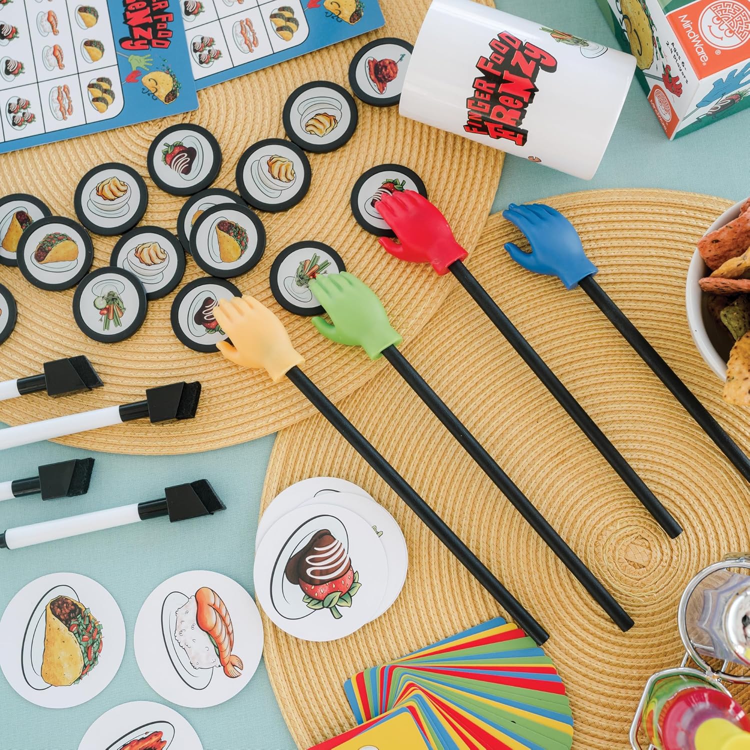 Finger Food Frenzy is a fast-paced, family-friendly board game where players race to fill their plates using tiny hand-shaped tools. Grab your food chips, turn over the cards, and be the first to complete six plates to claim the title of Ultimate Foodie Champion! Fun for kids and adults alike, this game boosts dexterity, reflexes, and problem-solving skills.