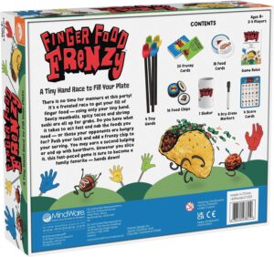 Finger Food Frenzy is an exciting and interactive board game perfect for kids and families. Players compete to fill their plates with delicious finger foods—from saucy meatballs to spicy tacos and sushi—using tiny hand-shaped tools, racing against one another to complete six plates first and win the game. Each round is fast-paced, challenging players’ dexterity, reflexes, and problem-solving abilities while providing plenty of laughs and friendly competition.