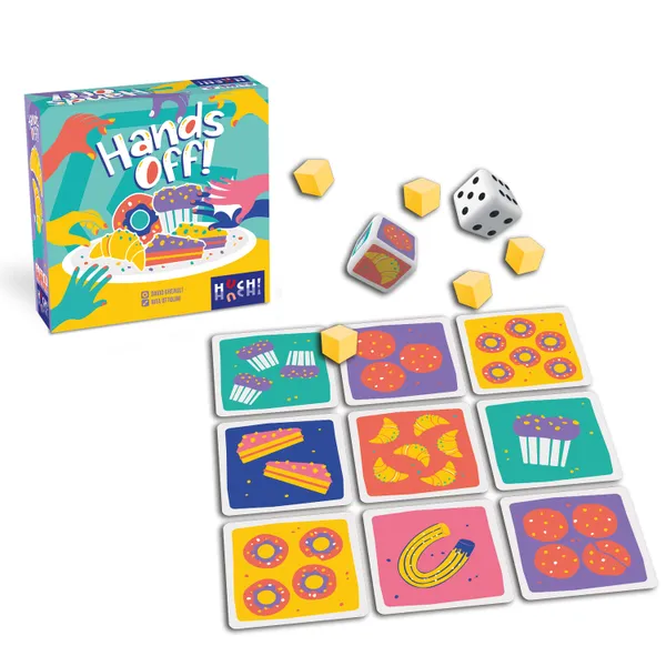 Hands Off! challenges players to put their reflexes and visual discrimination to the test in a lively, competitive setting. Each round, two dice are rolled—one showing a number and the other a candy or treat—and players must instantly locate and touch the card that matches the exact combination. Speed is everything, as everyone plays at the same time and only the quickest reactions are rewarded.