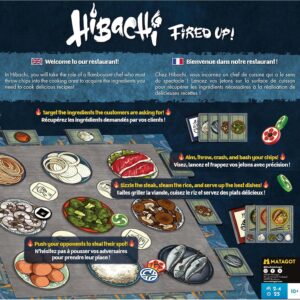 Once the throwing round ends, ingredients and money are resolved, and chefs who are ready can cook their dishes to perfection. This new standalone edition of Hibachi features faster, more streamlined rules, keeping the action tight and exciting from start to finish. With bold moves, dramatic throws, and constant competition, Hibachi: Fired Up! delivers a lively tabletop experience that’s as thrilling as a real hibachi show.