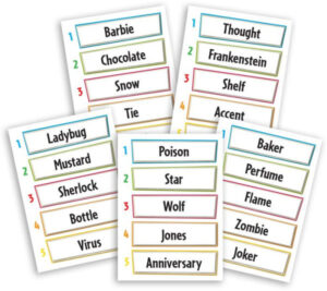 After eliminating duplicate clues, reveal the remaining clues to the active player. If they correctly guess the mystery word, your team scores a point. If they decline to guess, you don’t score the current card. If they guess wrong, you don’t score the current card and you lose one of the points you had already scored. Thus, be original, but not so original that you don’t help the active player guess correctly!