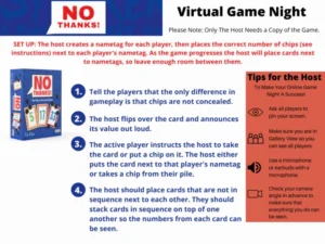 The deck contains cards numbered from 3 to 35, but with several removed each game, forming runs is risky and unpredictable. Runs of consecutive numbers score only the lowest value, encouraging careful planning and a bit of daring. Chips are worth negative points, making them valuable both for dodging bad cards and reducing your final score. Fast, tense, and full of bluffing and brinkmanship, No Thanks! is an elegant family and travel game that’s easy to learn, quick to play, and endlessly replayable.