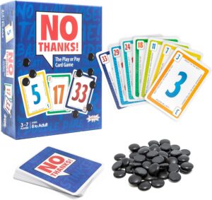In No Thanks!, the rules are wonderfully simple, but the decisions are anything but. On your turn, you must either spend one of your limited chips to avoid the current face-up card or take the card—along with any chips other players have placed on it—and reveal the next one. Each numbered card adds points to your score, and since the goal is to finish with the lowest total, every choice matters.