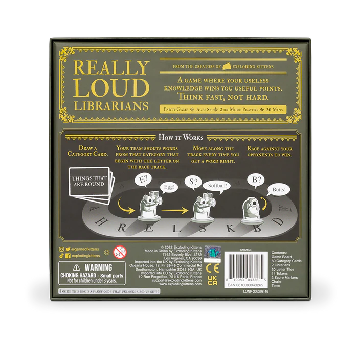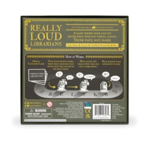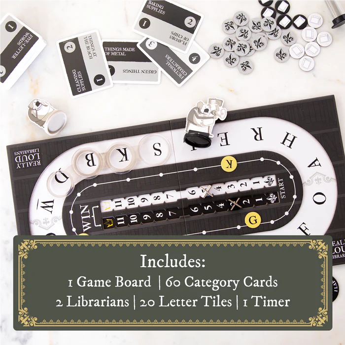 Really Loud Librarians is a high-energy word game that transforms random trivia knowledge into a competitive, race-to-the-finish showdown. Each round begins with a category card, everything from animals to food to famous places. Players must then shout out words that fit the category and begin with the letter shown on the race track. Each correct word moves their team forward, creating a rapid-fire burst of shouting, laughter, and clever thinking.