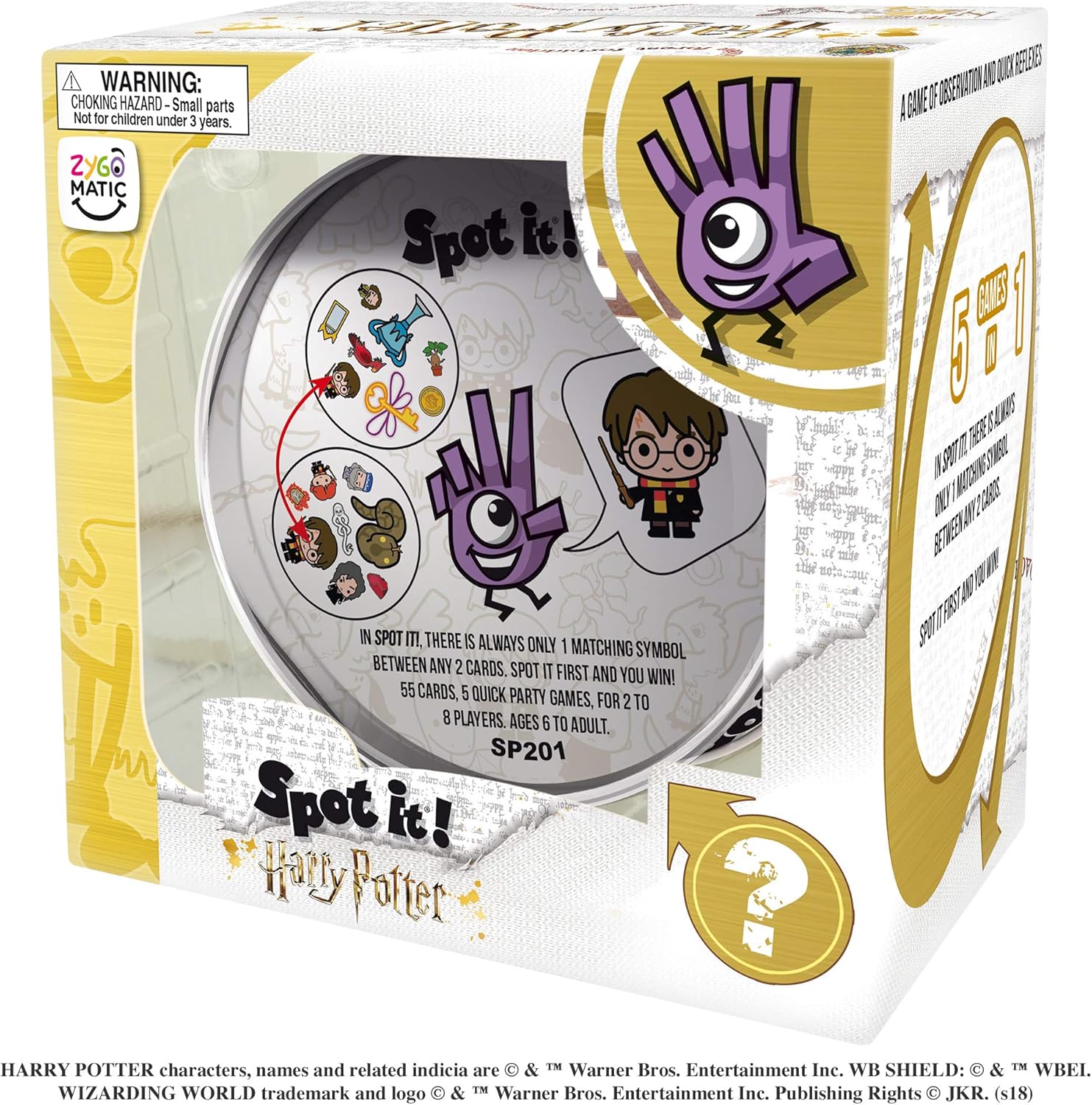 Spot It! Harry Potter brings the magic of the Wizarding World into the fast-paced, observation-based gameplay of the classic Spot It! card game. Players race against one another to find the single matching symbol between any two cards, featuring iconic imagery such as Harry Potter, Hermione Granger, Ron Weasley, Hogwarts house crests, wands, magical creatures, and more. Every match is a test of sharp eyes and quick reactions.