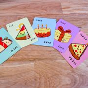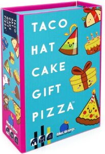 In Taco Hat Cake Gift Pizza, players take turns placing cards into a central pile while saying the five-word sequence: taco, hat, cake, gift, pizza. When the spoken word matches the card played, it’s an all-out race to slap the pile and the last player to react must pick up all the cards. The aim is simple: be the first to get rid of your entire hand.