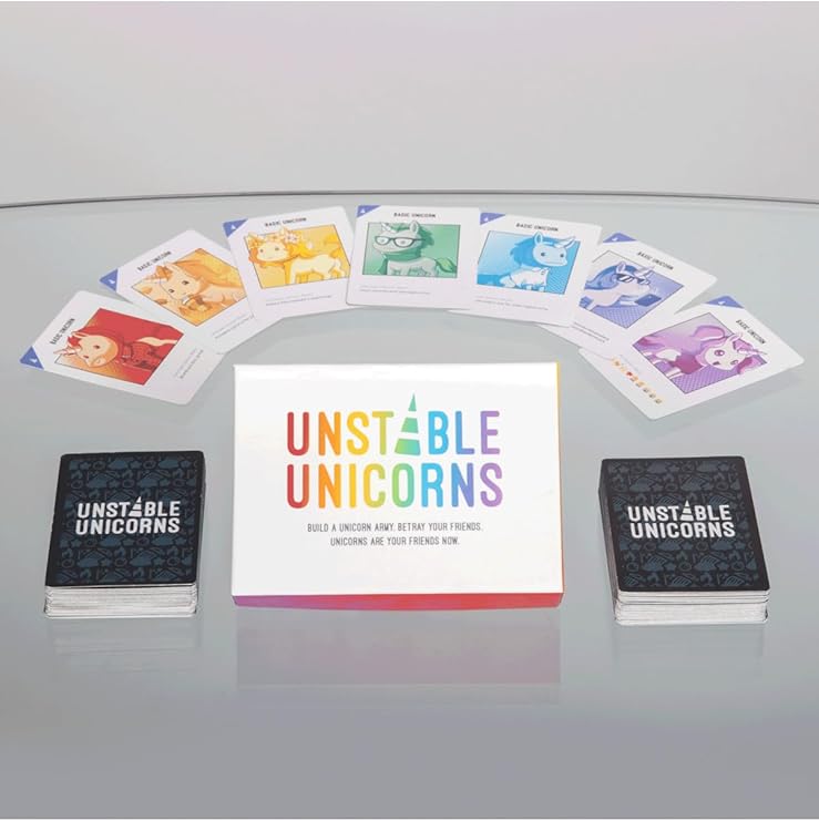 Unstable Unicorns is a chaotic and strategic card game where friendship is optional and unicorns rule the day. Each player starts with a Baby Unicorn in their Stable and races to build an army of 7 Unicorns to win. Along the way, use Magic, Instant, Upgrade, and Downgrade cards to protect your Stable or destroy your opponents’ Unicorns.